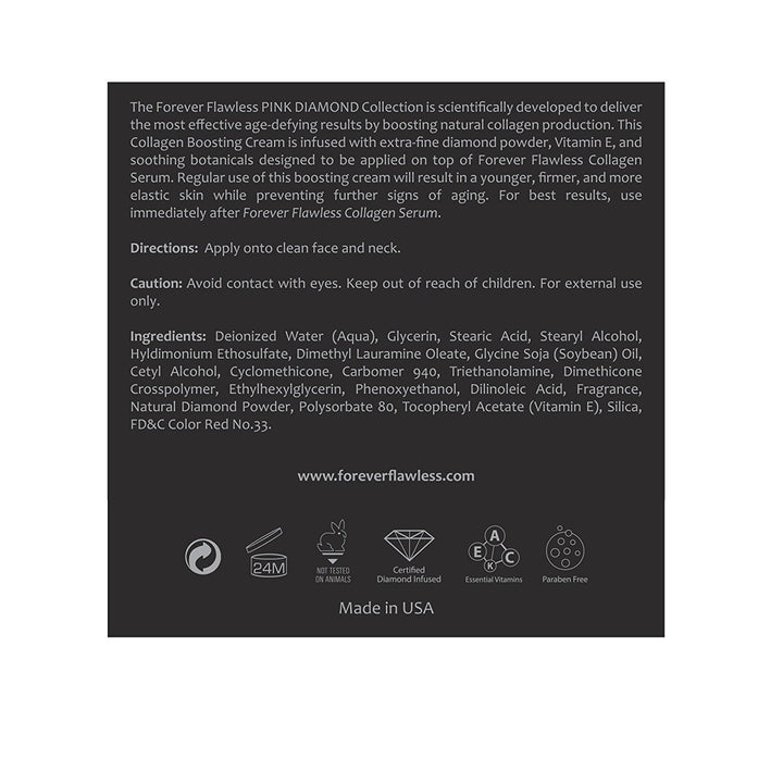 - ๐ WHY DIAMONDS ? The Forever Flawless Diamond Infused Collagen Boosting Cream contains a special ingredient, extra-fine natural diamond powder. Our research team has discovered that skin care products containing extra-fine diamond powder gently exfoliated the top layer of skin, allowing the vitamins, moisturizers, botanicals, and age-defying ingredients in our products to penetrate deeper and more effectively.
